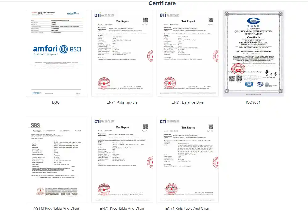 Sertifikaadid naguEN71jaASTMnäitavad, et meielaste ja väikelaste trike for on läbinud spetsiaalsed testid, et teha kindlaks, kas materjalid on mittetoksilised, kas nurgad lõikavad käsi ja kas osad on tugevad ning vastab ohutusstandarditele.